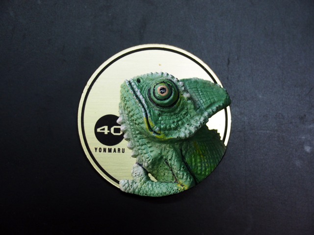爬虫類メダル型マグネット【MEDANETS】 エボシカメレオン ヨンマルデフォルメ感を生かした、 半立体のメダル型マグネットです。 ベースプレートのYONMARUのLOGOは彫刻処理。 ゴールドヘアラインベースのみとなります。 直径 5.5cm 高さ 約2.3cm 樹脂製 ※基本的にノークレーム・ノーリターンでお願い致します。 気になる点などは、ご注文前にお気軽にご質問ください。 ※完全手作り品ですので多少の色合いの違いなどがございます。